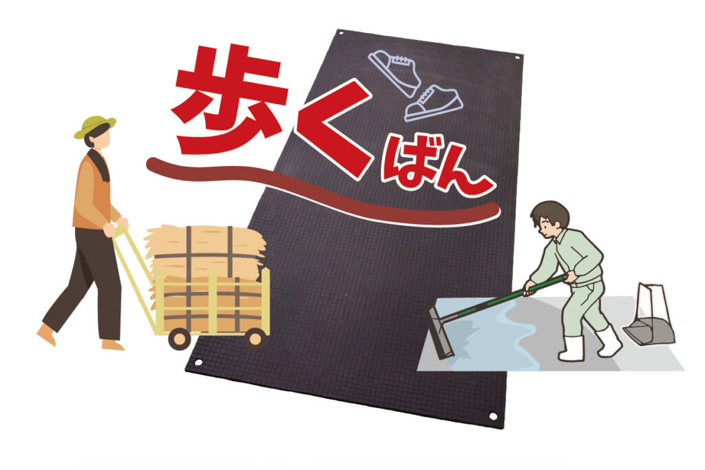 台車やハンドリフト・カーゴ等の車輪が小さいものだとトラック等の走行に推奨の滑り止めは走行時のガタつきの原因になります。歩くばんはほぼフラットな表面加工で屋内外の歩行や台車走行におススメです。